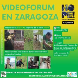 El próximo martes 4 de junio a las 17.30 horas en la Biblioteca del Centro de Salud de Valdespartera (Zaragoza), el grupo de medioambiente del Distrito Sur me ha invitado al Videoforum sobre la serie «Hope», en una tertulia abierta en la que hablaremos de esperanzas en la agricultura, el consumo y el medio ambiente.