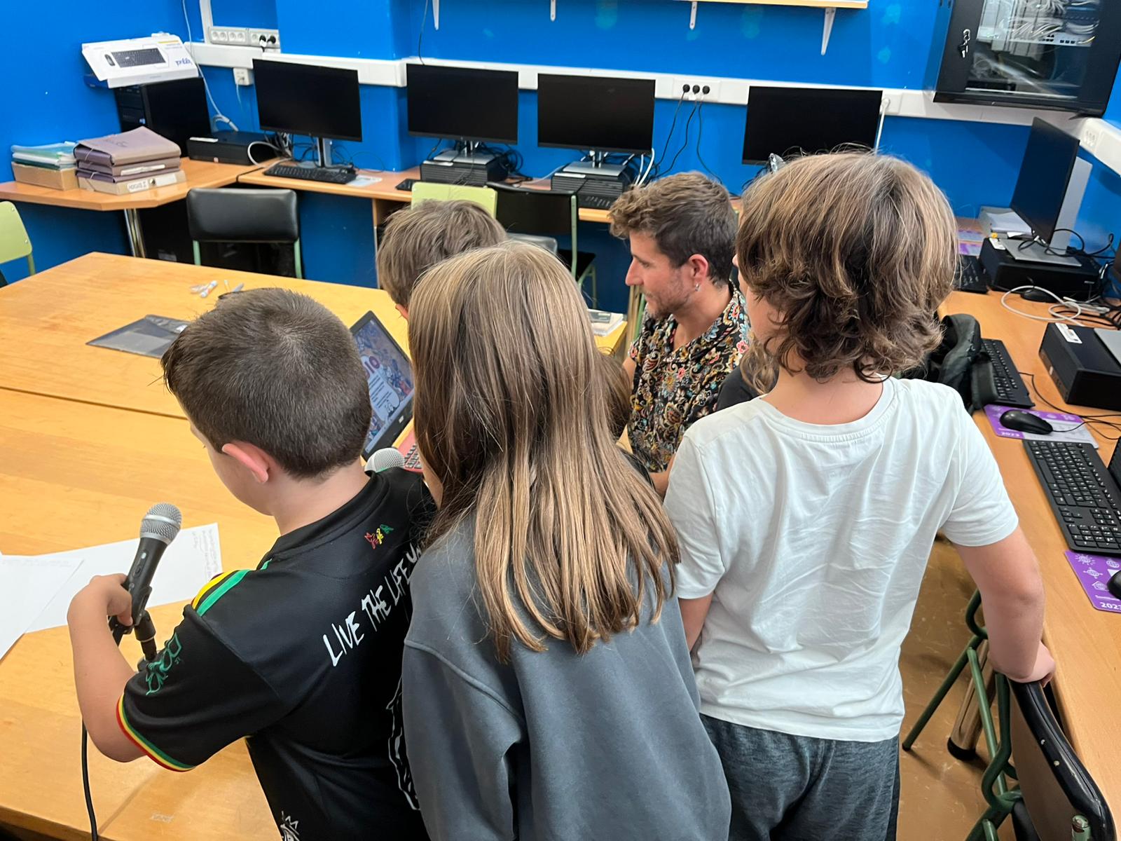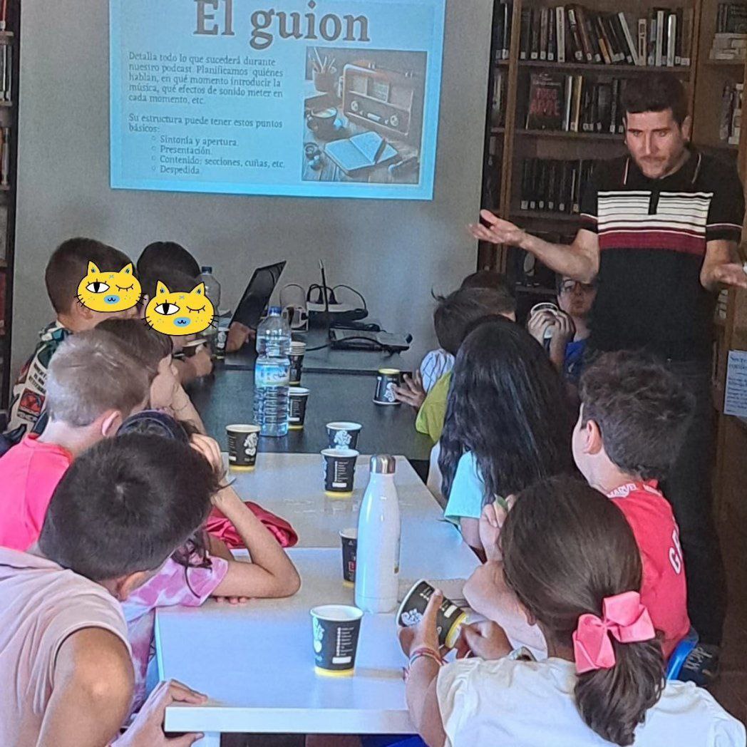 El miércoles 3 de julio de 2024 disfrutamos de un taller de radio y podcast en la Biblioteca El Olmo de Villlafranca de Ebro. La actividad se llenó con 15 niñas y niños de entre 8 y 12 años, a