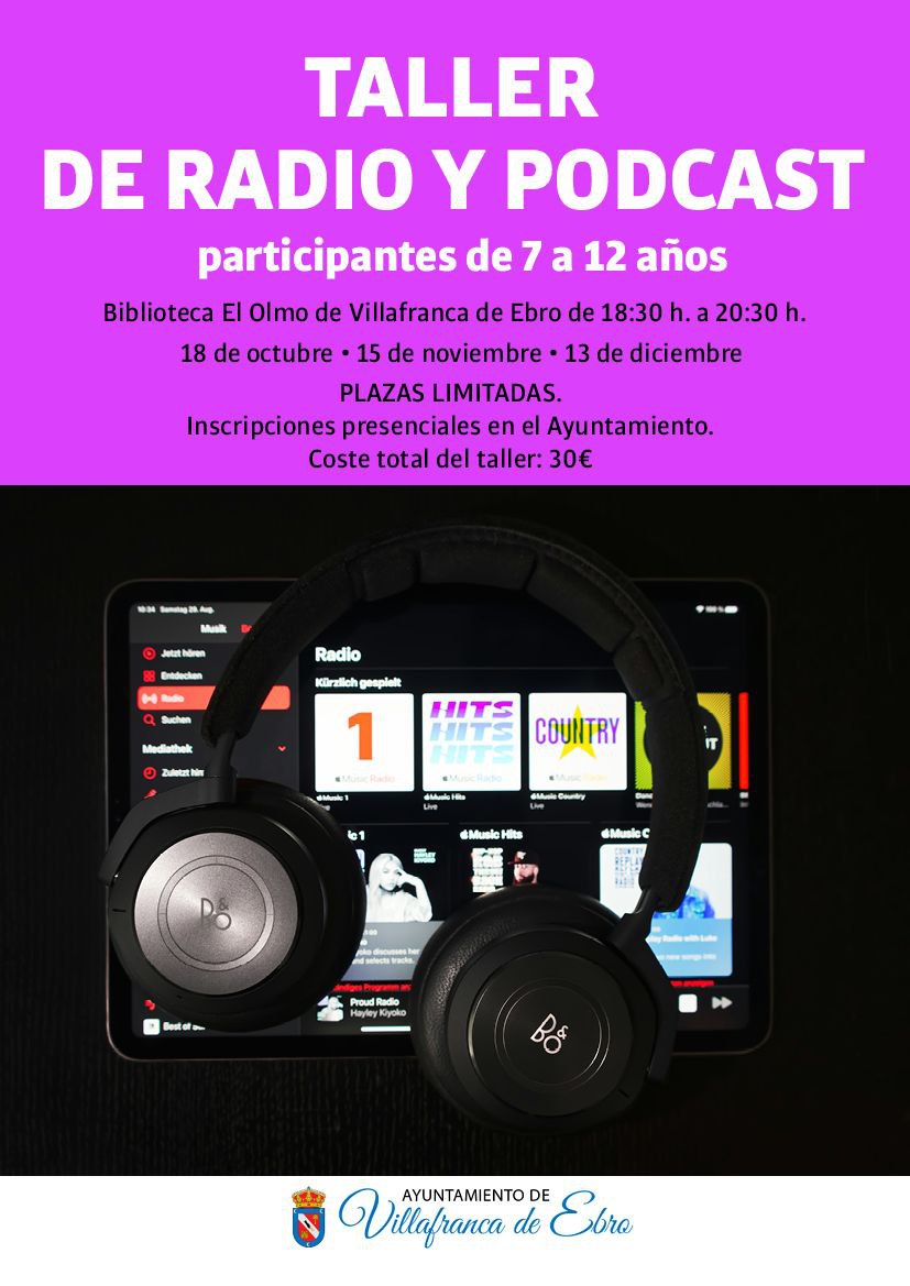 El Ayuntamiento de Villafranca de Ebro organiza este Taller de radio y podcast dirigido a niños y niñas de entre 7 y 14 años, que se celebrará durante 3 tardes de octubre, noviembre y diciembre en la biblioteca del pueblo.