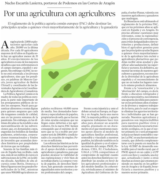 Aragón pierde 2000 explotaciones agrícolas cada año. 20.000 en la última década. Por cada 10 agricultores mayores de 65 años en España sólo hay 1 agricultor menor de 35 años. El envejecimiento de los agricultores es uno de los mayores